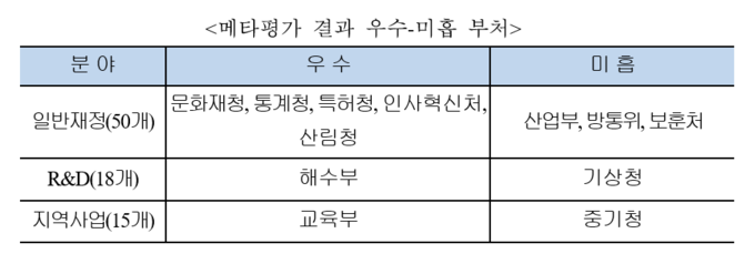 기재부 등은 분야별 평가결과에 따라 일반재정분야는 우수부처로 문화재청, 통계청, 특허청, 인사혁신처, 산림청 등 5개, 미흡부처로 산업부, 방통위, 보훈처 등 3개를 선정하고, R&D와 지역사업 분야는 우수부처로 해수부와 교육부, 미흡부처로 기상청과 중기청 등 각 1개씩을 선정했다.