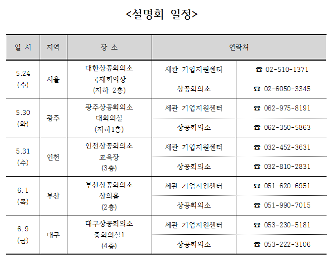 설명회는 이달 24일 서울을 시작으로 ▲광주(5월 30일) ▲인천(5월 31일) ▲대구(6월 1일) ▲부산(6월 9일)에서 진행된다. 참여를 희망하는 업체는 해당지역 본부세관 수출입기업지원센터에 문의하거나 상공회의소에 신청하면 된다.