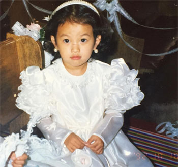 공개된 사진 속에서 그녀는 하얀색 드레스를 입고, 머리띠를 한 채 카메라를 바라보고 있다.