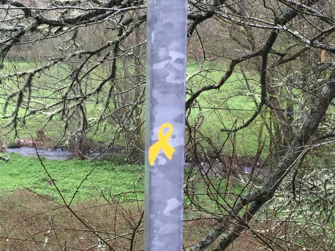 ▲ 비가 조금씩 내리기 시작한다. 출발한지 얼마 안되어 누군가 붙여 놓은 세월호 추모 노란리본 모양발견했다. 비오는 이국땅에서 웬지 마음이 아파온다. 오늘 비가 눈물인가 보다.
