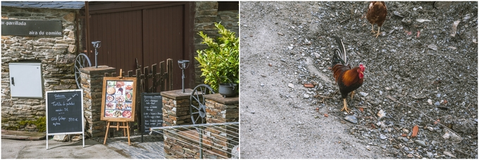 쉽게 발견할 수 있다. 2군데 정도의 숙소가 더 있어서 늦게 도착하는 경우 머물렀다 갈 수 있는 마을이다. 식당 앞 돌 위에 걸 터 앉아 쉬고 있는데 멋지게 생긴 수탉이 앞을 어슬렁 거리며 다닌다.