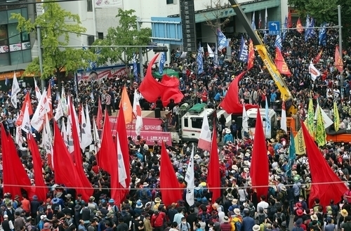 또 이날 ‘6.30 사회적 총파업 대회’ 선언문을 통해 민노총은 “최저임금 1만원, 비정규직 철폐, 노조 할 권리! 사회적 총파업의 깃발을 세우고 노동자 민중이 세상을 바꾸고 있다”고 했다.