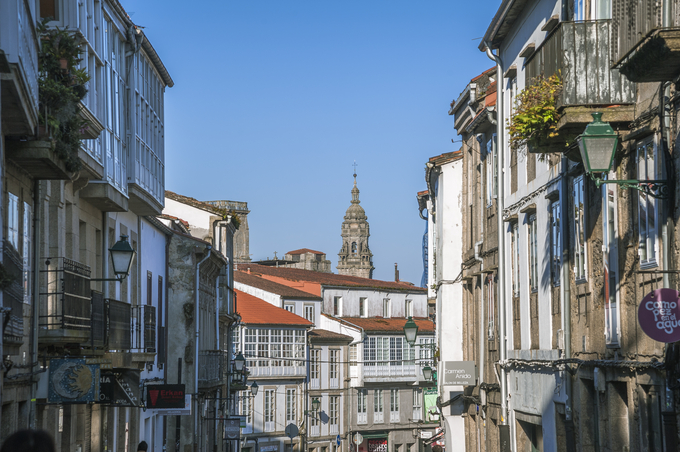 ▲ 다리를 건너 도시 안을 따라 산티아고 성당으로 가는 동안 툰다를 비롯한 순례자들이 앞서 가고 있는 것이 보인다. 도시 안을 제법 걸어왔다는 느낌이 들 때쯤 건물 들 지붕 위로 성당 첨탑이 보이기 시작한다.