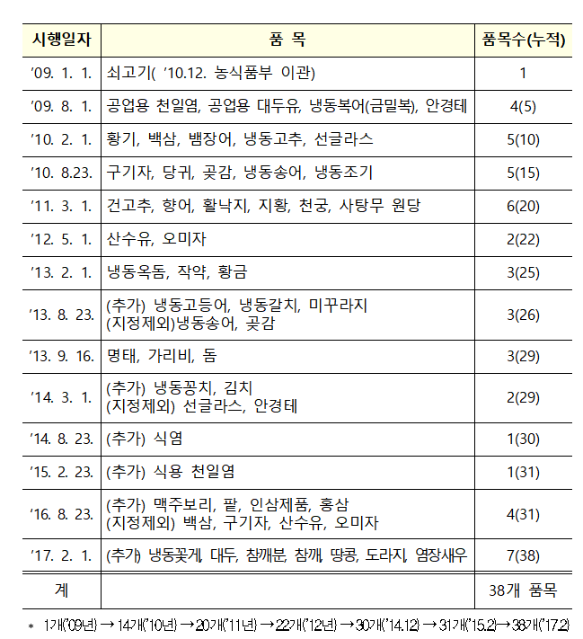 유통이력 관리대상 품목수은 지난 2014년 30개에서 2015과 2016년 31개로 늘어났고 올해는 38개로 대폭 확대됐다.