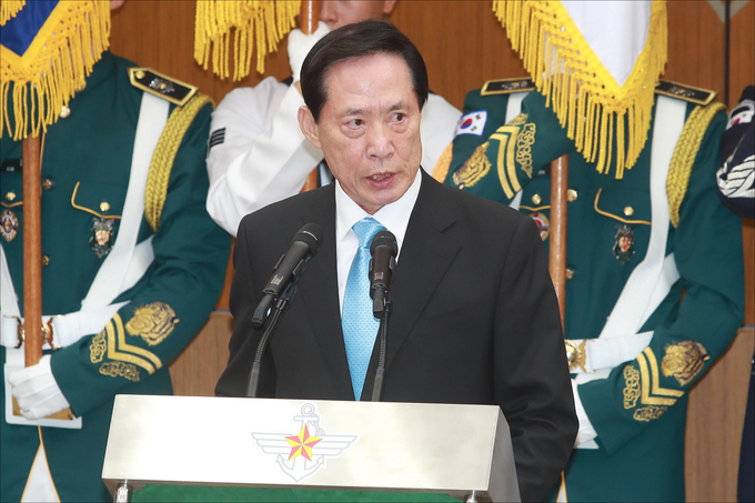 송영무 신임 국방부 장관이 14일 오전 서울 용산구 국방부에서 열린 장관 이·취임식에서 취임사를 하고 있다.