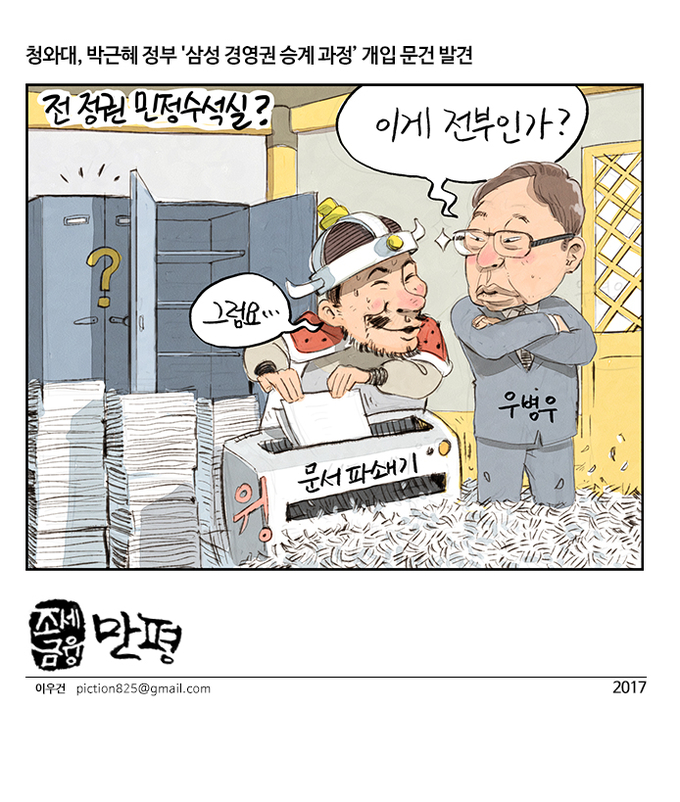 [조세금융만평] 청와대, 박 전 정부 '삼성 경영권 승계 과정' 개입 문건 발견