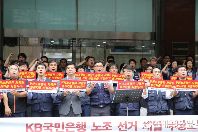 (조세금융신문=김필주 기자) 전국금융산업노동조합 KB국민은행 지부(KB국민은행 제1노조 정식 명칭)가 사측인 KB국민은행이 노동조합 위원장 선거에 개입하는 등 부당노동행위를 일으킨 증거를 공개했다.