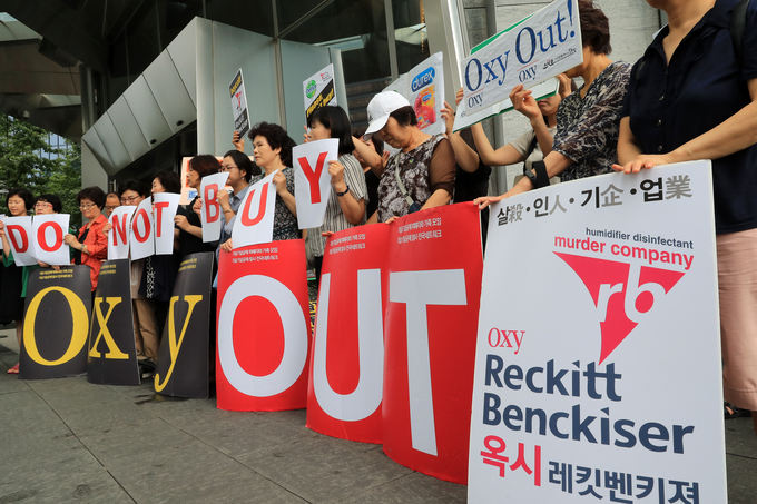 31일 오후 서울 여의도 옥시 본사 앞에서 열린 가습기살균제 참사 살인기업 처벌촉구 6차 캠페인에서 참석자들이 관련 내용의 피켓을 들고 있다