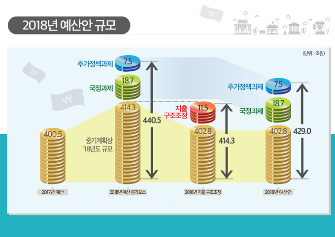 국정과제 18.7조원과 추가정책과제 7.5조원이 배정됐으나, 11.5조원의 지출구조조정을 통해 재정부담을 완화한다.