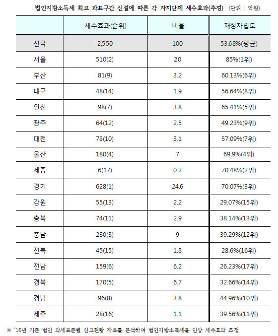 행안부가 제출한 ‘지방소득세 개정안에 따른 추정 세수효과’ 자료에 따르면 법인지방세에 한정해 각 지자체별 세수효과를 추정했을 경우 총 세수효과 2550억원 중 수도권(서울·경기·인천)이 48%인 1236억원 가량을 가져간다.