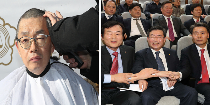 이날 오후 대한변호사회 김현 회장 등은 국회 앞에서 삭발식을 갖고 세무사법 개정안에 강력히 반발하는 모습을 보였다. (사진 좌측)