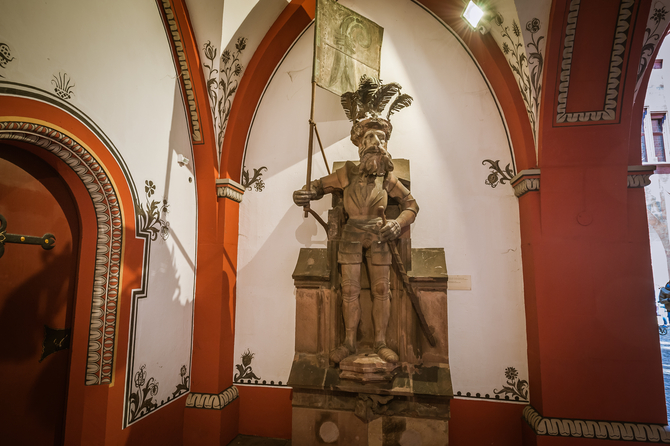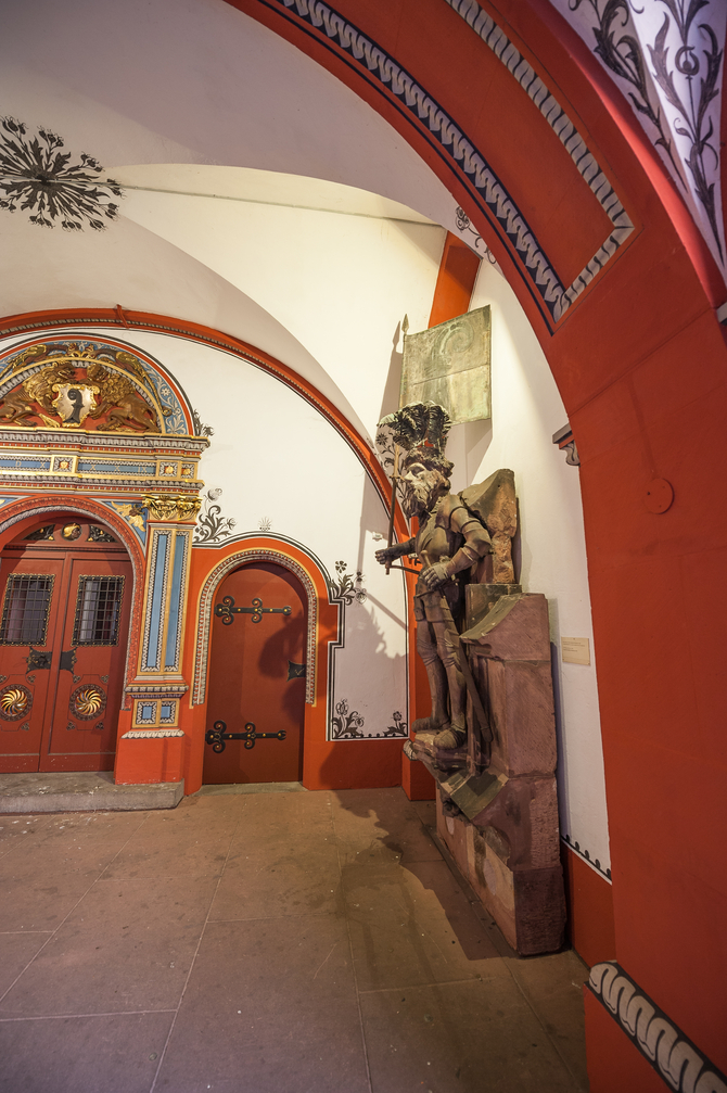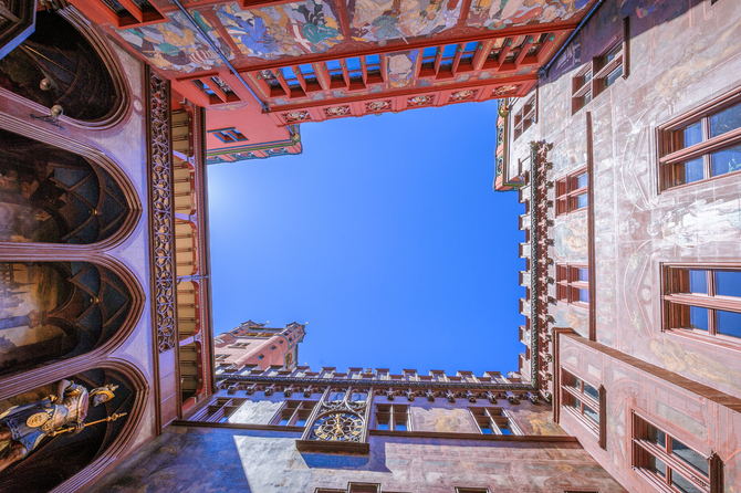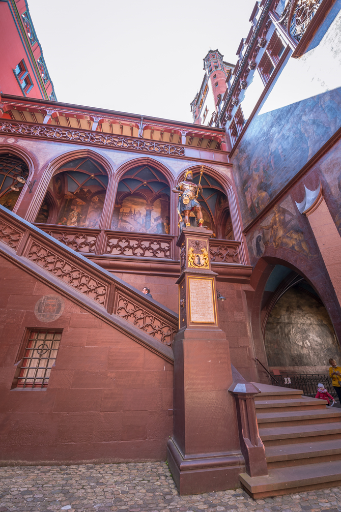 시청사는 붉은 색으로 되어있는 건물 자체가 역사이면서 예술품이다. 주변은 물론 스위스의 다른 건물과도 확실히 대비되는 붉은색 벽돌로 된 건물은 인상적이다. 전면은 물론 내부에도 프레스코화가 그려져 있는 것도 인상적인 요소이다. 16세기에 재건축되었고, 1904년에 탑을 양쪽으로 늘여서 지금의 모습이 되었다고 한다. 내부 정원에는 그 시대 유물이 몇 점 남아있다.