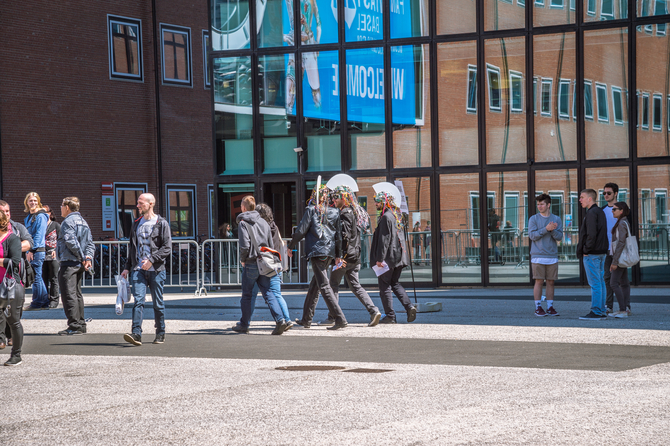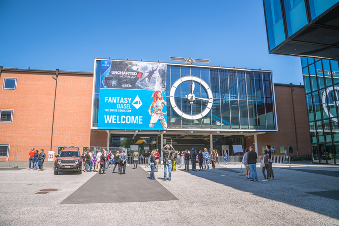 ▲ 바젤 박람회장으로 보이는 건물에 사람들이 입장하고 있다. 도로 양편에 유리된 현대식 건물이 있고 아이언맨, 스파이더맨 등 여러가지 코스프레를 한 사람들이 지나가거나 모여 있는 모습을 볼 수 있었다.