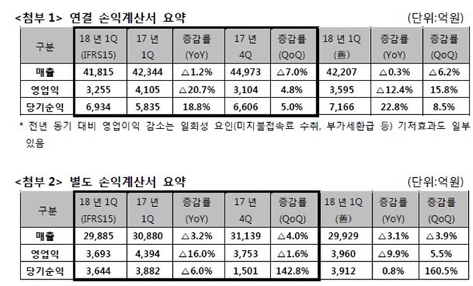 SK텔레콤 관계자는 “미디어 사업 성장 등 자회사 실적이 개선됐으나 이동통신사업 수익 감소와 회계 기준 변경 등으로 인해 매출과 영업이익이 줄었다”고 설명했다.