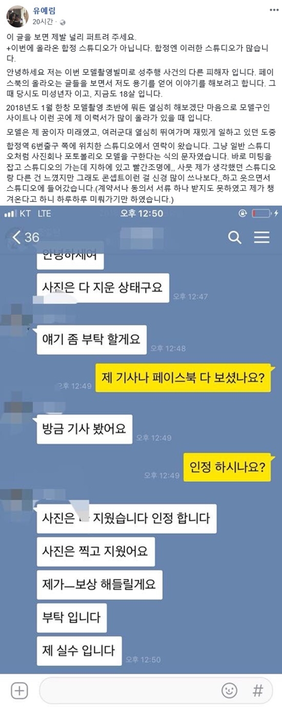 18일 유예림은 자신의 SNS에 "올해 초 합정역 소재의 한 스튜디오에서 모델 아르바이트라며 비슷한 피해를 당한 적이 있다"고 폭로해 이목을 모았다.