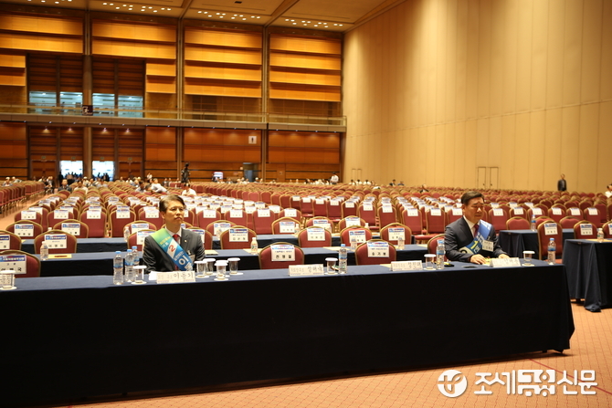오후 1시부터 소견문 발표가 예정된 가운데 기호 1번 임채룡 회장 후보와 기호 2번 이동기 회장 후보가 회원들이 총회장에 들어서지 않아 썰렁한 총회장을 지키고 있다.