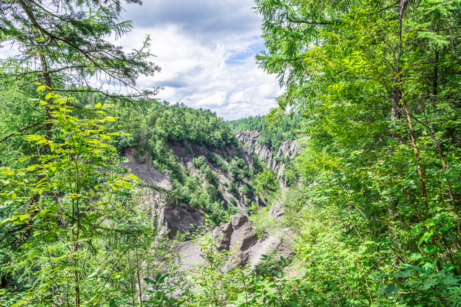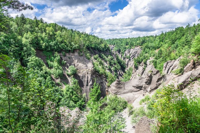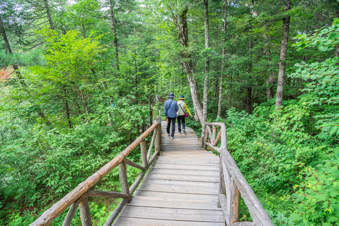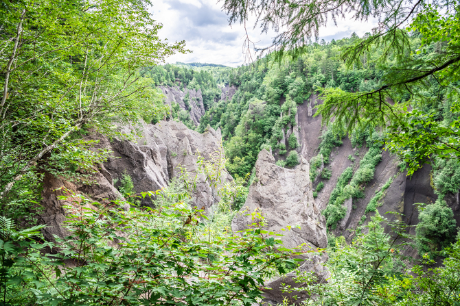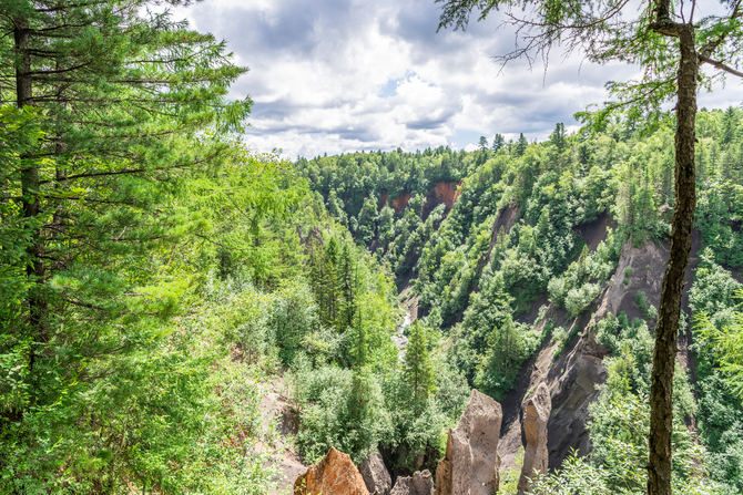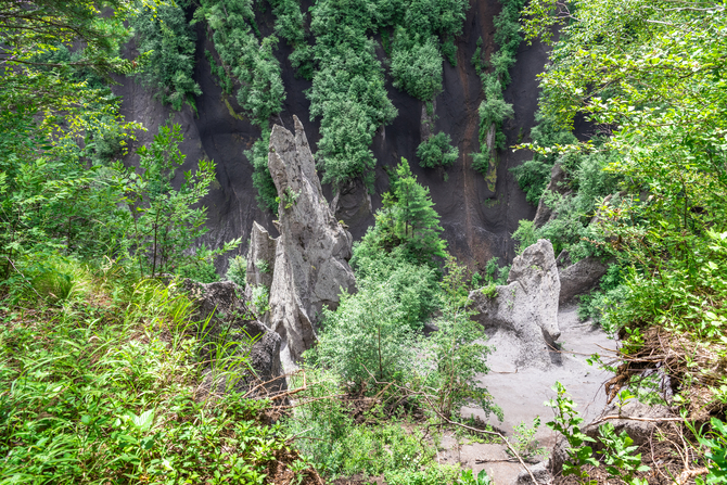 협곡을 따라 내려가다 보면 협곡 아래 기암괴석들이 보였다 말았다 하며 사람들의 시선을 끈다. 백두산 화산 용암에 의해 만들어진 풍경이고, 주변에는 울창한 숲이 펼쳐져 있다.