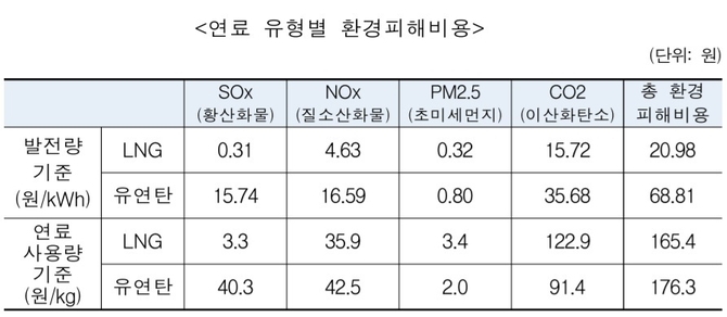 다만, 유연탄은 화력발전의 원료가 되는 만큼 전기요금 인상 부담을 고려해 LNG에 대한 세금을 낮추는 방안을 함께 권고했다.