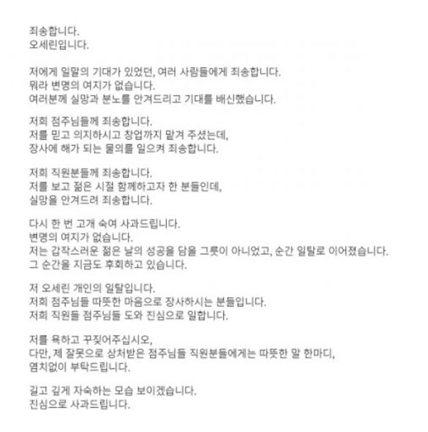 하지만 실망감을 더해간 그는 "모든 잘못을 뉘우치겠다. 경솔했고 어리석었다. 나를 더 질타해라"고 사죄한 바 있으나 이날 또다시 점주들의 원성을 사고 있다.