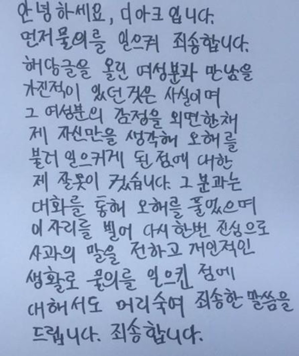 당시 A씨는 디아크에게 성관계를 강요받았다고 털어놨으나 이에 대해 그는 자필 사과문과 함께 이를 정정, 합의된 사안이었다고 밝히며 두 사람이 갈등을 원만히 해결했다고 전했다.