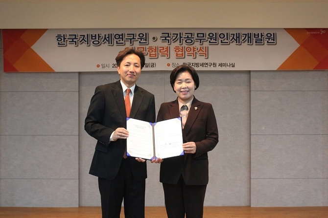 (조세금융신문=고승주 기자) 한국지방세연구원과 국가공무원인재개발원이 지난 12일 업무교류협력 협약을 체결하고, 지방세 공무원 역량 강화를 추진한다.