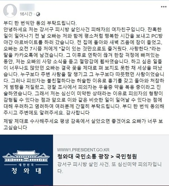 이어 "그 이후로 한참 연락이 끊겨 걱정에 빠져 있는 동안, 저는 오빠의 사망 소식을 듣고 절망에 빠졌다"면서 "심신미약을 빌미로 피의자의 형량이 감형될까 우려된다. 제대로 수사해 주길 바란다"고 덧붙였다.
