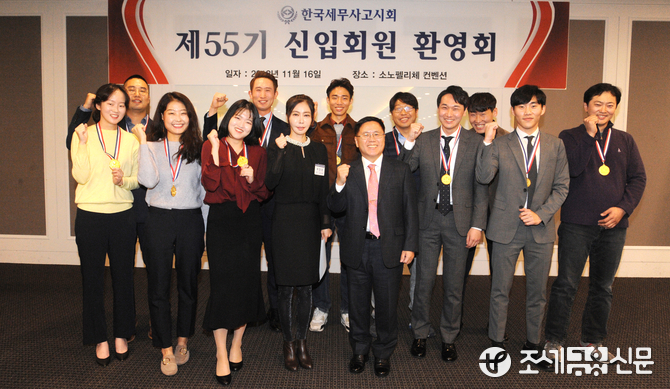 (조세금융신문=김용진 기자)곽장미 한국세무사고시회 회장(왼쪽네번째)이 16일 오후 서울 도심공항소노펠리체에서 열린 제55기 신입생 환영식에서 수상자들과 파이팅을 외치고 있다.