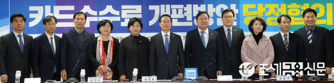 (조세금융신문=김용진 기자)홍영표 더불어민주당 원내대표(왼쪽여섯번째)가 26일 오전 국회 의원회관에서 열린 카드 수수료 개편 방안 당정협의회에 앞서 최종구 금융위원장과 참석자들이 포즈를 취하고 있다