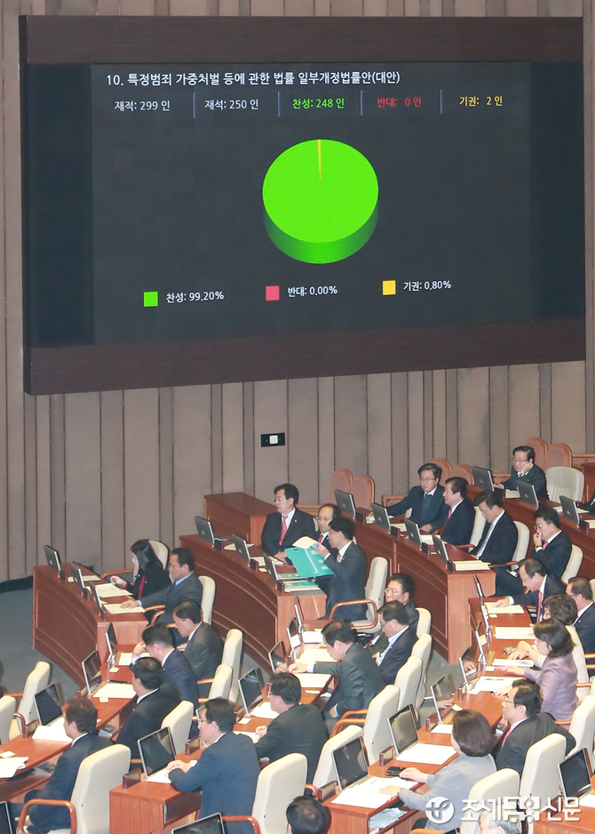 (조세금융신문=김용진 기자)29일 오후 국회에서 특정범죄 가중처벌 등에 관한 법률 일부개정법률안 윤창호 법이 본회의를 통과하고 있다