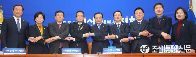 (조세금융신문=김용진 기자)이해찬 더불어민주당 대표(왼쪽다섯번째)가 3일 오전 국회에서 열린 당대표·최고위원 취임100일 합동 기자회견에 앞서 홍영표 원내대표, 박주민 최고위원 등 지도부와 손을 맞잡고 있다