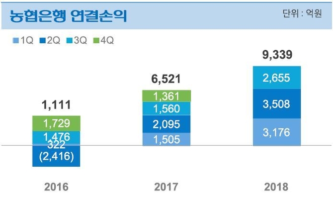 이 행장이 올해 초 설정했던 실적 목표액은 7800억원으로 3분기 만에 초과 달성했다. 여기에 4분기 실적까지 더할 경우 사상최초로 1조원 클럽에 가입할 수 있을 것으로 전망된다. 농협중앙회에 납부하는 농업지원사업비를 포함할 경우 3분기 누적 순이익(1조924억원)은 이미 1조원을 넘어섰다.