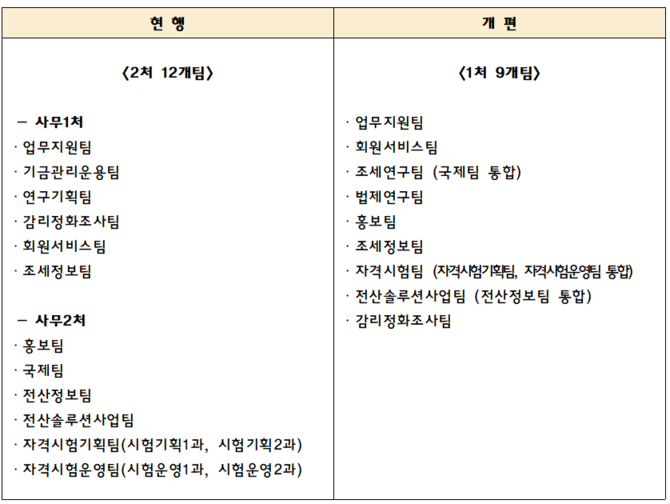 그러나, 4차 산업혁명·인공지능 발달 등 갈수록 복잡 다양해지는 세무서비스 시장에서 연구와 법제의 중요성이 대두되고 있는 만큼 기존 연구기획팀은 조세연구팀과 법제연구팀으로 분할해 책임과 기능을 강화하기로 했다.
