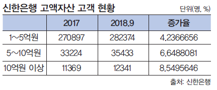 고액 자산 고객수도 시중 은행 중 가장 많은 수를 자랑하고 있다. 9월말 기준 투자 자산 10억원이상에 해당하는 고객 수는 1만2341명으로 은행권 1위를 차지하고 있다. ‘5~10억원’과 ‘1~5억원’에 해당하는 고객들도 각각 3만5433명, 28만2374명을 기록하며 은행권 2위 자리에 올라있다.