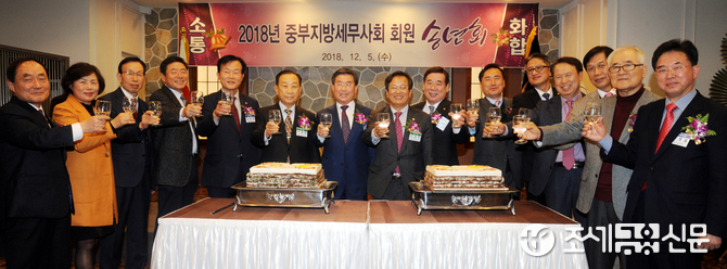 (조세금융신문=김용진 기자)이금주 중부세무사회장과 이창규 한국세무사회 회장 등 업계 주요인사들이 5일 오전 서울 서초동 더바인에서 열린 중부세무사회 송년회에서 참석자들과 건배를 하고 있다