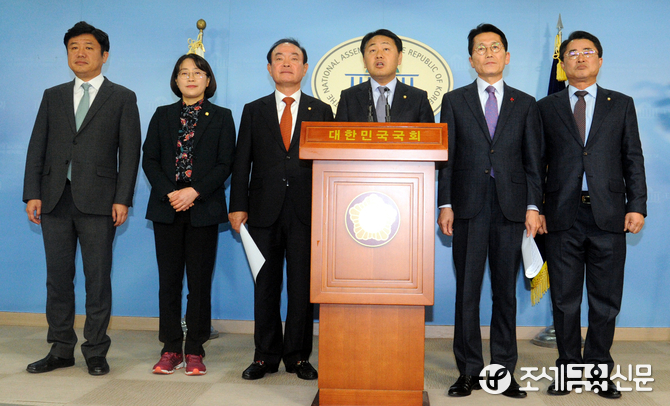 (조세금융신문=김용진 기자)야3당 지도부가 6일 오후 국회 정론관에서 예산안 관련 더불어민주당과 자유한국당 간 합의에 대해 규탄하는 기자회견을 하고 있다. (왼쪽부터) 유의동 바른미래당 원내수석부대표, 추혜선 정의당 원내수석부대표, 김관영 바른미래당 원내대표, 윤소하 정의당 원내대표, 장병완 민주평화당 원내대표, 최경환 민주평화당 원내수석부대표.