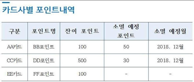 주요 제공정보로는 ▲카드 보유 개수 ▲이용한도 ▲결제일 ▲결제예정금액 ▲연체금액 ▲결제계좌 ▲카드사별 잔여 포인트 ▲소멸예정포인트 등이 있다.