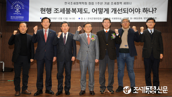 (조세금융신문=김용진 기자)오문성 한국조세정책학회 회장이 13일 오후 서울 은행회관에서 열린 한국조세정책학회 창립1주년 기념 조세정책 세미나에서 이창규 한국세무사회 회장, 김용민 연세대학교 법무대학원 교수, 김완일 한국세무사회 부회장이 참석자들과 파이팅을 외치고 있다