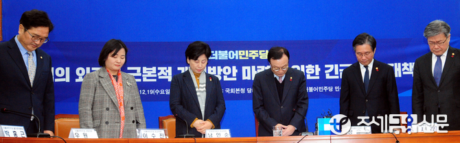 (조세금융신문=김용진 기자)이해찬 더불어민주당 대표, 성윤모 산업통상자원부 장관, 이재갑 고용노동부 장관 등이 19일 오전 국회에서 열린 '위험의 외주화 근본적 개선방안 마련을 위한 긴급 당정대책회의'에서 태안 화력발전소에서 사고로 사망한 고(故) 김용균 군을 추모하는 묵념을 하고 있다.