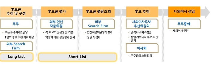 사추위는 인선자문위원 평가 결과를 토대로 평판조회 등을 거친 후 사추위원의 논의를 통해 신임 사외이사 후보를 결정한다. 후보자가 결격사유 심사를 통과하게 되면 내년 3월 정기 주주총회에 사외이사 후보로 최종 추천된다.