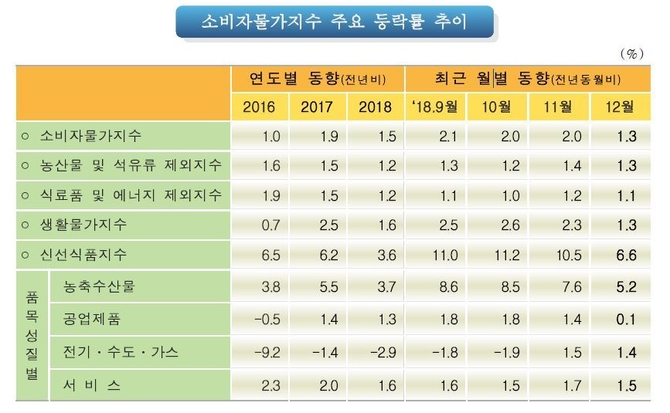 농축수산물이 3.7%로 가장 높은 물가상승률을 기록했으며 서비스 품목이1.6%로 그 뒤를 이었다. 공업제품의 물가상승률은 1.3%를 기록했으며 전기·수도·가스 물가는 2.9% 하락했다.