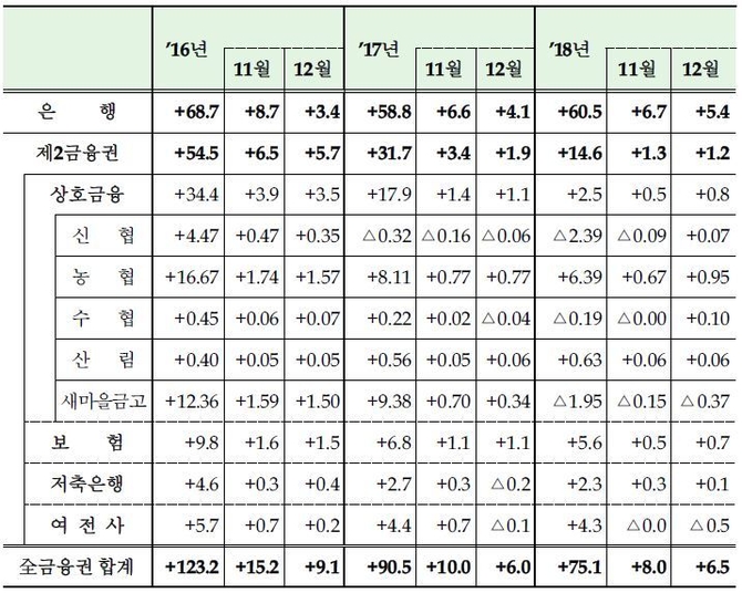 지난해 은행권 가계대출 증가액은 60조5000억원으로 전년(58조8000억원) 대비 소폭 증가하는 모습을 보였다. 주택담보대출 증가폭이 37조2000억원에서 37조8000억원으로, 기타대출 증가폭이 21조6000억원에서 22조7000억원으로 각각 확대됐다. 제 2금융권 증가폭은 2017년 31조7000억원에서 14조6000억원으로 축소됐다.