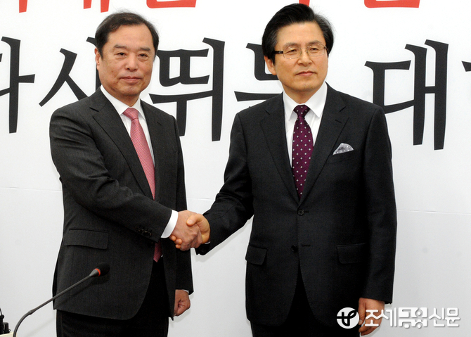 (조세금융신문=김용진 기자)15일 오전 국회에서 열린 황교안 전 국무총리(오른쪽)가 자유한국당 입당 환영식에서 김병준 자유한국당 비대위원장과 악수하고 있다.