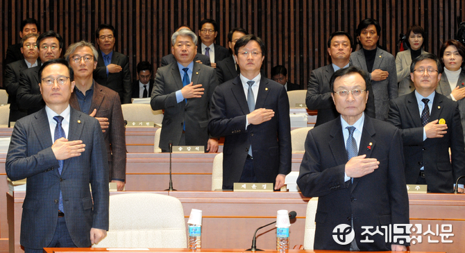 (조세금융신문=김용진 기자)이해찬 더불어민주당 대표가와 홍영표 원내대표, 의원들이 21일 오후 국회에서 열린 정책의원총회에서 국민의례를 하고 있다