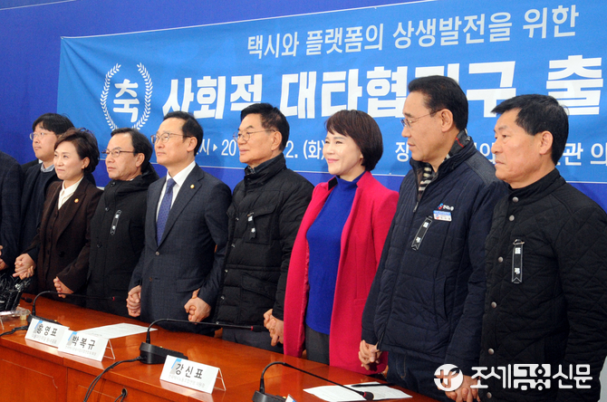(조세금융신문=김용진 기자)홍영표 더불어민주당 원내대표가 22일 오전 국회에서 열린 택시-카풀 사회적대타협기구 출범식에 앞서 참석자들과 기념 촬영을 하고 있다