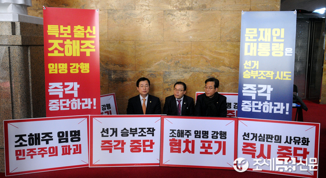 (조세금융신문=김용진 기자)25일 오전 국회에서 조해주 중앙선관위원 임명 강행으로 자유한국당 의원들이 연좌농성을 하고 있다
