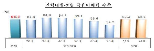 연령대별로는 30대가 64.9점으로 가장 높았으며 20대(18~29세)를 제외하면 연령이 높아질수록 금융이해력 점수는 낮아지는 것으로 확인됐다. 40대와 50대, 60대는 각각 64.1점, 63.1점, 59.6점을 기록했으며 70대는 54.2점으로 가장 낮은 점수를 보였다.