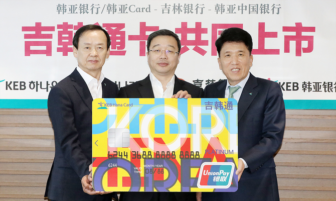 (조세금융신문=이기욱 기자) KEB하나은행이 지난 29일 중국 길림성 내 최대은행인 길림은행, 하나은행 중국법인과 공동으로 3사 공동 ‘길.한.통.(吉.韓.通.) 체크카드’를 출시했다.