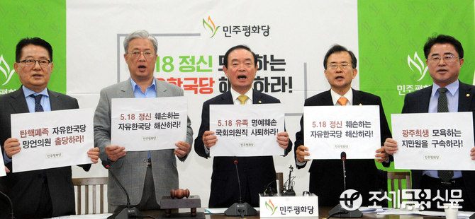 (조세금융신문=김용진 기자)장병완 민주평화당 원내대표와 의원들이 14일 오전 국회에서 열린 제42차 의원총회 및 제3차 5·18 역사왜곡대책특별위원회 연석회의에서 손피켓을 들고 자유한국당의 5·18 망언 발언을 규탄하고 있다.