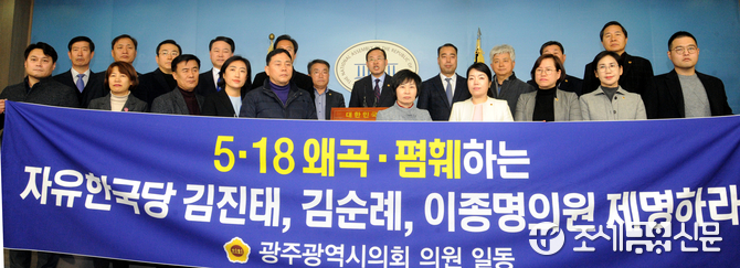 (조세금융신문=김용진 기자) 송갑석 더불어민주당 의원이 광주광역시의회 의원들과 14일 오후 국회 정론관에서 '5·18 왜곡·폄훼 김진태, 김순례, 이종명 자유한국당 의원 제명 요구 기자회견'을 하고 있다.