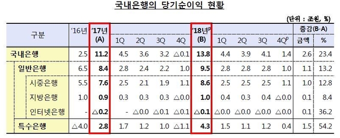 3일 금융감독원에 따르면 지난해 국내은행의 총 당기순이익은 13조8000억원을 기록했다. 이는 전년 11조2000억원 대비 23.4%(2조6000억원)나 증가한 수치다.